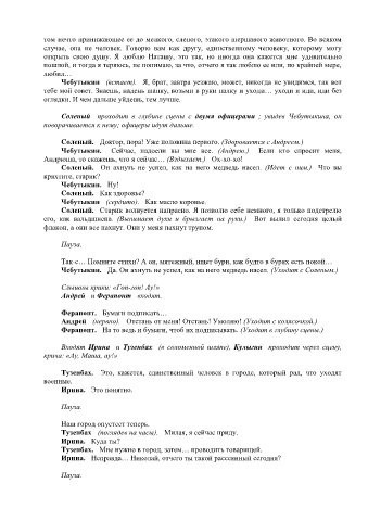 Соленый проходит в глубине сцены с двумя офицерами ; увидев Чебутыкина, он