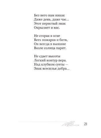 Без него нам никак Даже день, даже час... Этот перистый знак Окрыляет и нас. Не сгорая в огне Всех пожаров и битв, Он всегда в вышине Возле солнца парит. Не сдает высоты Легкий контур пера. Над клубком суеты — Знак всесилья добра... 21