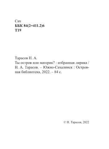 Сах ББК 84(2=411.2)6 Т19 Тарасов Н. А. Ты остров или материк? : избранная лирика / Н. А. Тарасов. – Южно-Сахалинск : Остров- ная библиотека, 2022. – 84 с. © Н. Тарасов, 2022 2