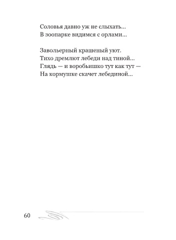 Соловья давно уж не слыхать... В зоопарке видимся с орлами... Завольерный крашеный уют. Тихо дремлют лебеди над тиной... Глядь — и воробьишко тут как тут — На кормушке скачет лебединой... 60